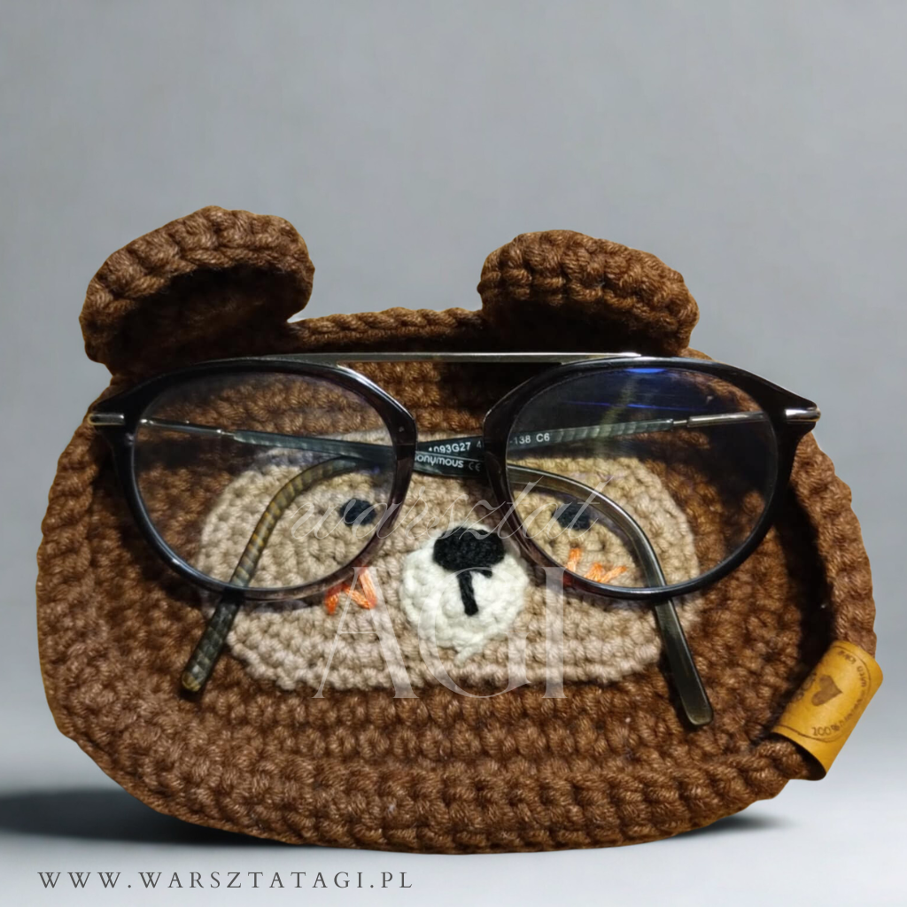 📏 Rozmiar ≈ 15 × 11 cm – mieści okulary korekcyjne, przeciwsłoneczne, nawet większe modele 🧶 Miękki, gruby splot z bawełny – bezpieczny dla szkieł i delikatnych oprawek 🐾 Nie zamyka się, nie jest etui do torebki – to po prostu uroczy „parking” na stole, biurku, szafce nocnej czy parapecie ✨ Ręcznie wyszyta buzia – każdy miś ma swój własny, lekko inny wyraz pyszczka 🌿 Skórzana metka „warsztat Agi” – mały, ale miły detal
